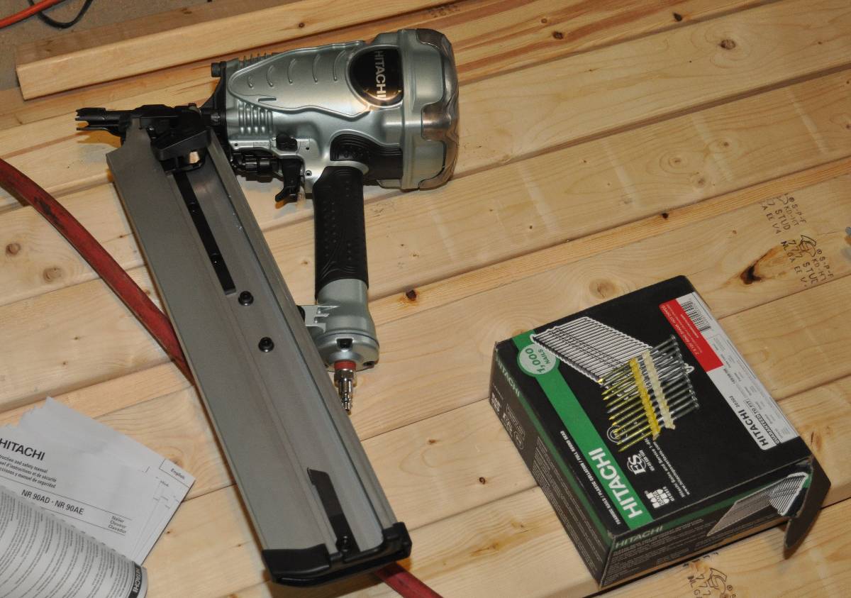 Lastly I got this nailer... 200 bucks for a Hitachi. The nails cost a bit more than your basic 3" carpenter nails but it more than makes up for it. I know you're only looking at one section of framing, and we took a couple hours all in all carefully measuring things and I had to actually read the instructions (after tearing out the 80% of it not in English) for the air powered nail gun since I've never used one before, and it does have the capacity to injure or kill. I was running it at about 75 PSI, and I think maybe I could crank it a little higher - it drove most of the nails just fine but a couple times it bounced and left them sticking out a bit, so I had to finish them off with an old fashioned hammer (a 20-ounce Craftsman I bought back in 1985 when I did my first framing ever). I also got a concrete nailer (not shown)... 22 caliber. Probably won't be driving that many concrete fasteners, but back in 85 I beat those wedge nails in by hand with the aforementioned hammer, sparks flying. I won't be doing that this time. Anyway... for a change I bought some new tools AND used them the same day.