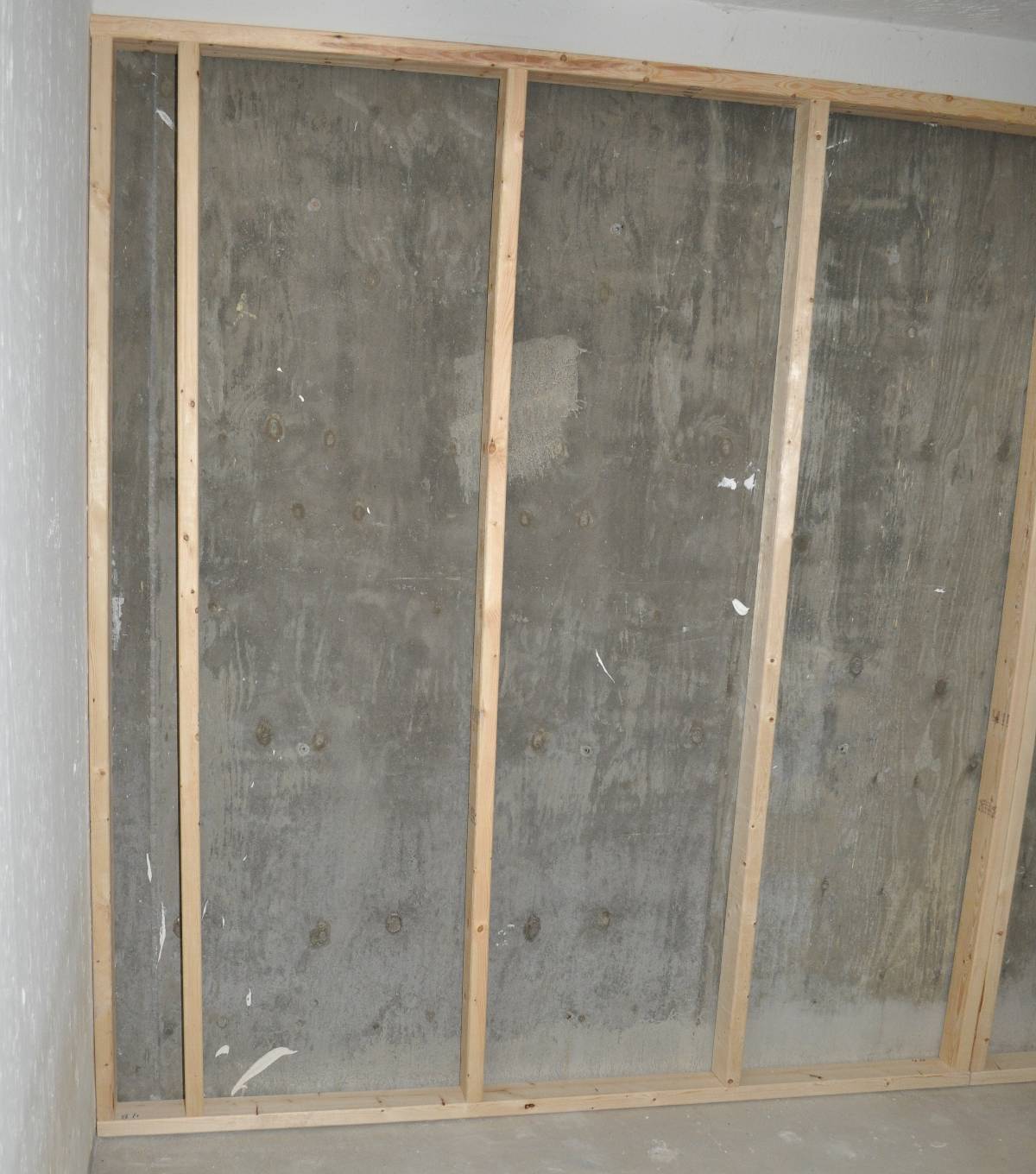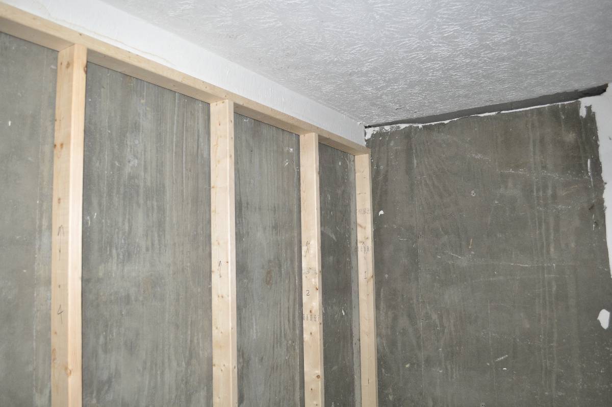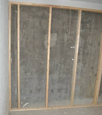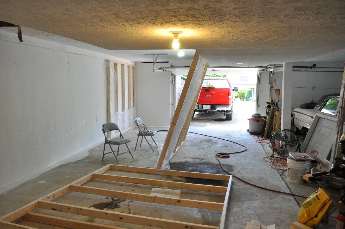 Looking the other way. The crappy looking wall there is structural - sort of. Builder had to reinforce the back wall with a 6' tee, and this is it. It's actually a foot thick, solid concrete with some crappy framing and drywall splatter over it. I'll just butt against it, clean it up and paint it. This will be staging anyway, no need for beauty.
