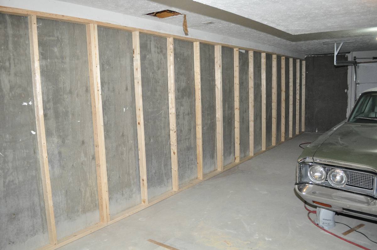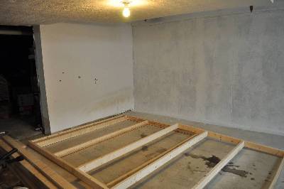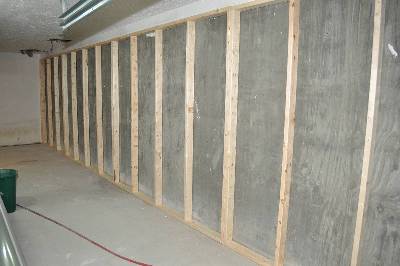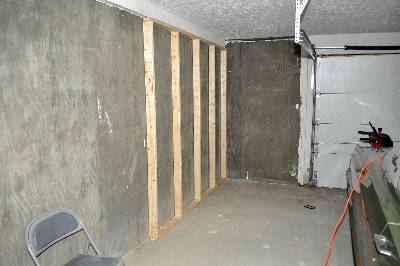 Day two - Feb 13, 2011 - things moving along faster. In about 2 1/4 hours, we measured, cut, assembled and put up three more framing sections. The concrete wall is now framed in. Have not done the concrete nails at the bottom yet, we'll wait to make sure everything is cool before we do that since they are pretty difficult to remove.