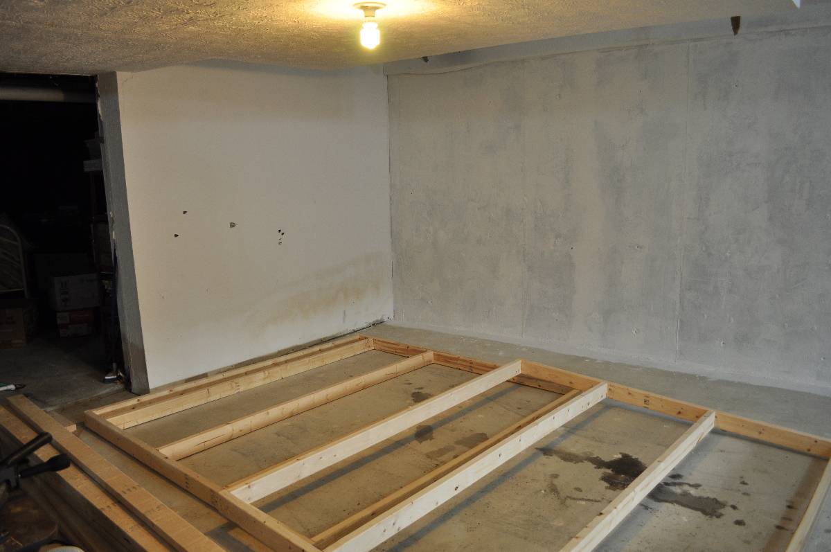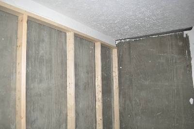 down temporarily in order to give the wall and floor below the studs two coats of Dry-Loc. It's sort of like drywall