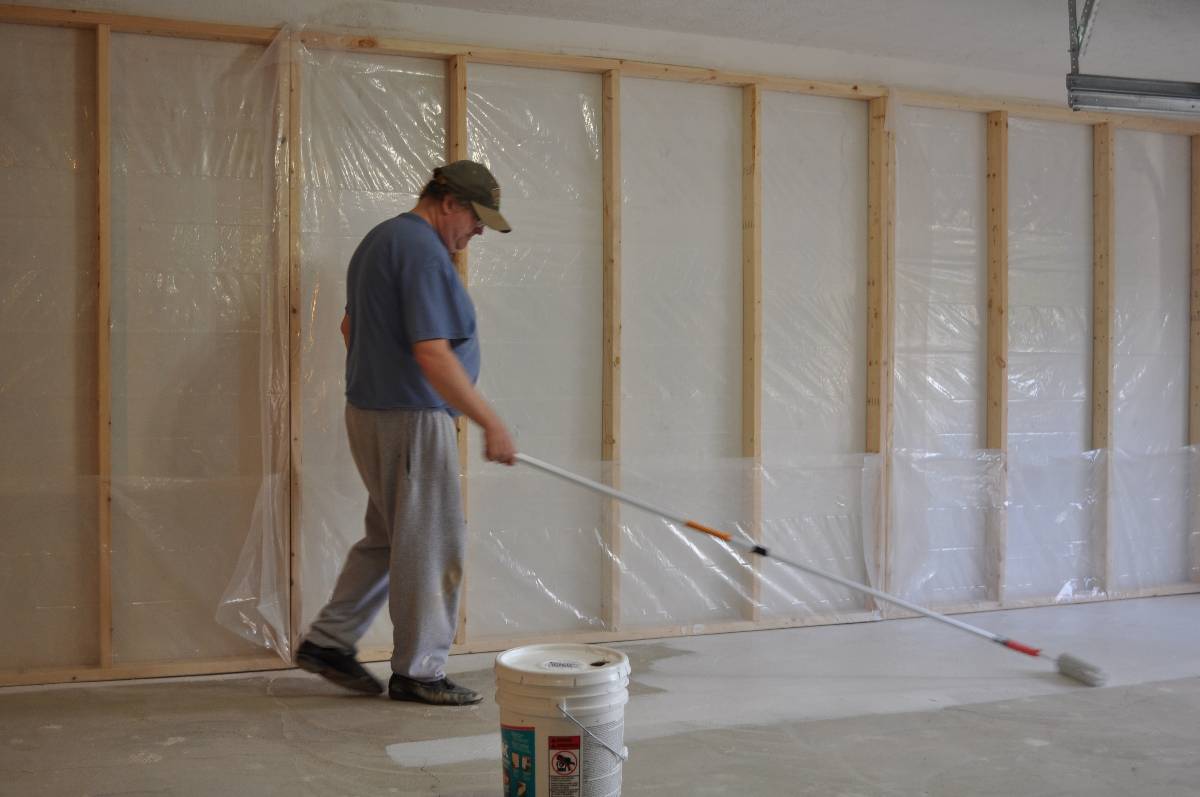 And then rolling the first of two coats of Dry-Loc onto the floor, just between where the walls of the staging area