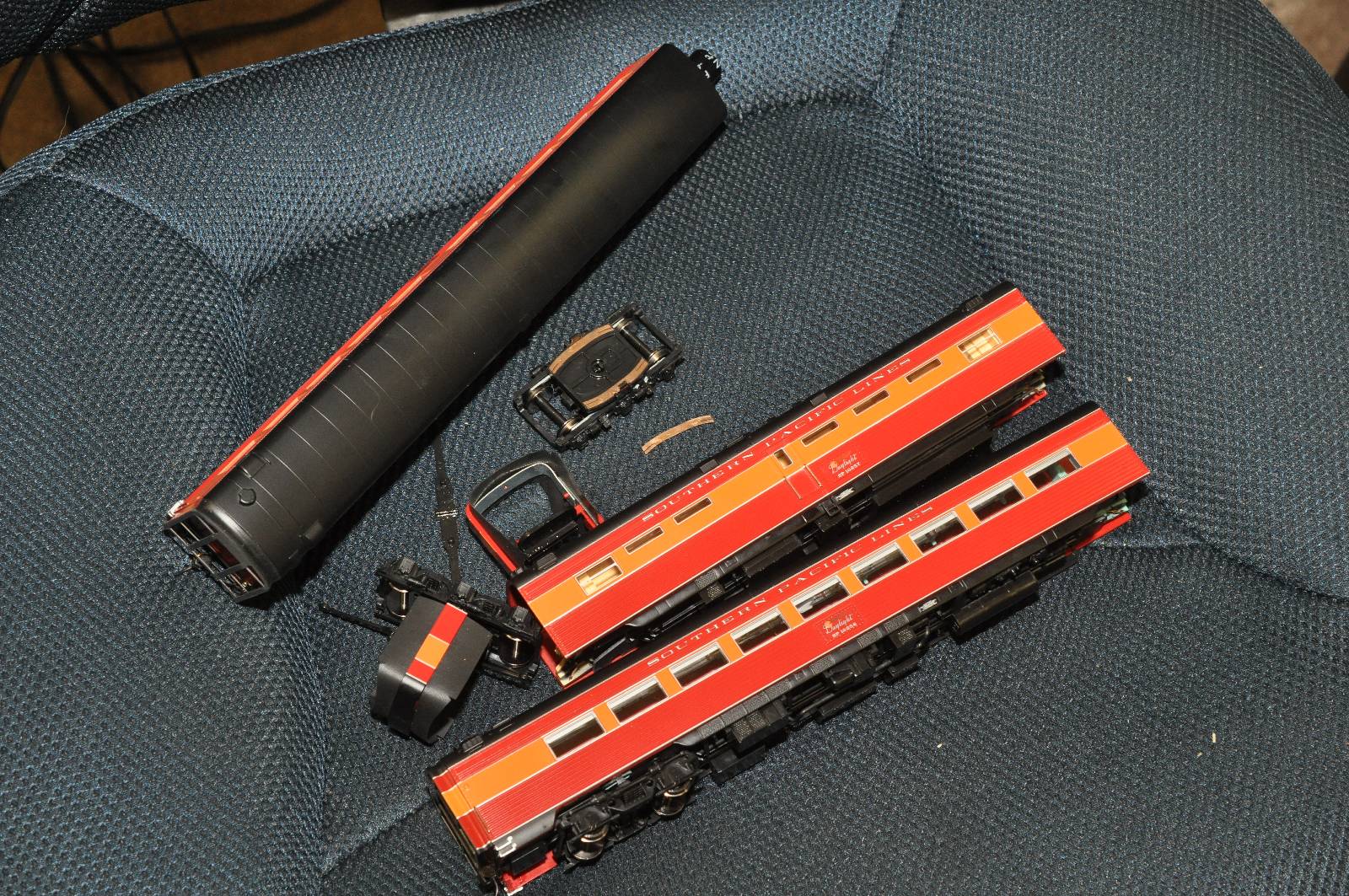 Broadway Limited has made a very nice set of cars for several different Southern Pacific Daylight consists. In this case I chose the 1941 Morning Daylight just because it was the first one I came across a good deal on some of the cars. The articulated joints - of which there are many - are well designed up to the point of operation, and they operate well. Where they fail miserably is once they come apart. You will see Ken Silvestri's video on youtube of him holding the 3-unit diner and you'll notice his hands never leave their death grip on the joints between the cars. That's because here's what happens if you let go. After spending nearly 2 hours trying to get the triple diner back together, taking it to the track only to have it come apart again, I simply kicked the shit out of it. Which only knocked it back apart again, upon which I began to think of ways to actually fix the problem, permanently.