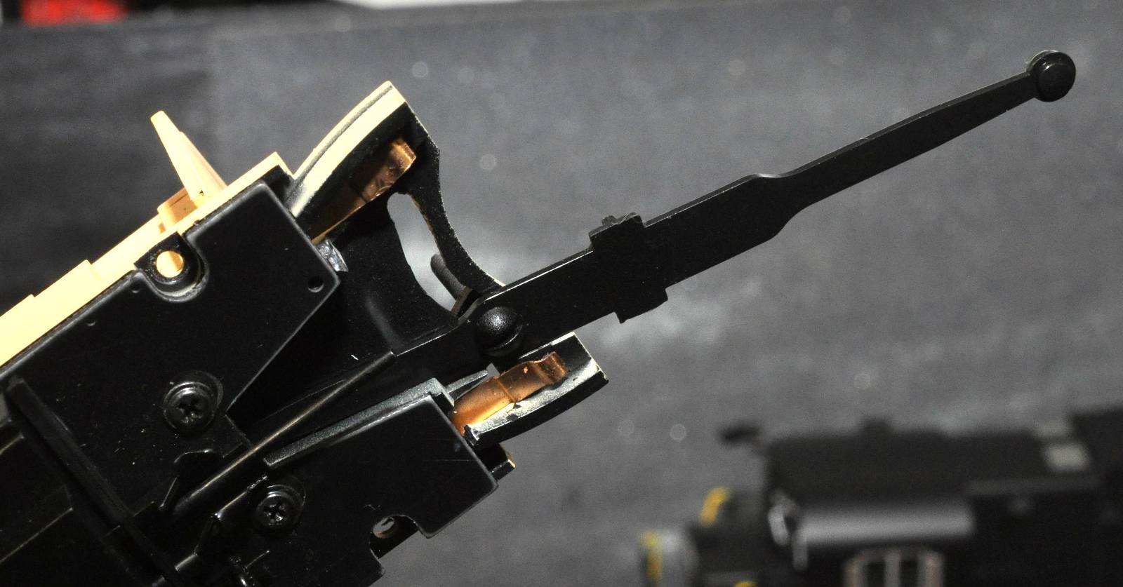 The truck and contact plate look like this in original form. The flat area between the contacts is what's supposed to keep the pin from disengaging the groove. It does not. What it does do.. well... is prevent you from ever re-engaging it on the track level. Well we don't need this anymore and in fact the screw head that's now holding it all together will rub against this and cause binding.