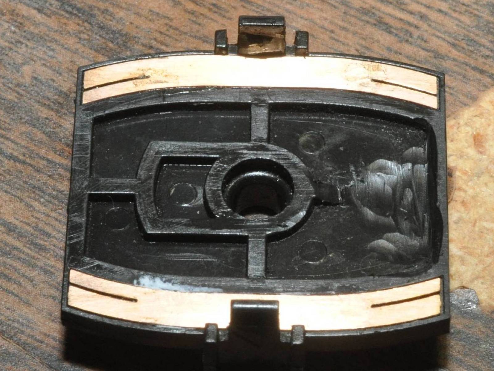 The answer is to just cut away all of this material in between. The contacts are left intact and the basic shape of the part isn't disturbed - it's delrin and rather thick anyway. You need to be sure not to take off the snap lugs that fasten this part to the diaphragm center piece, and of course the snap pin that holds the truck to the contact piece.