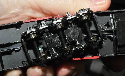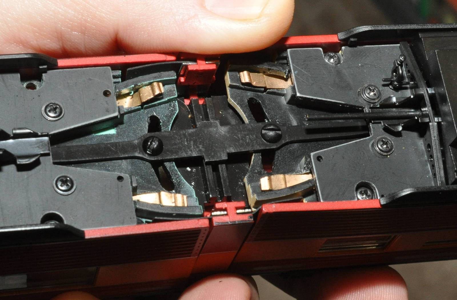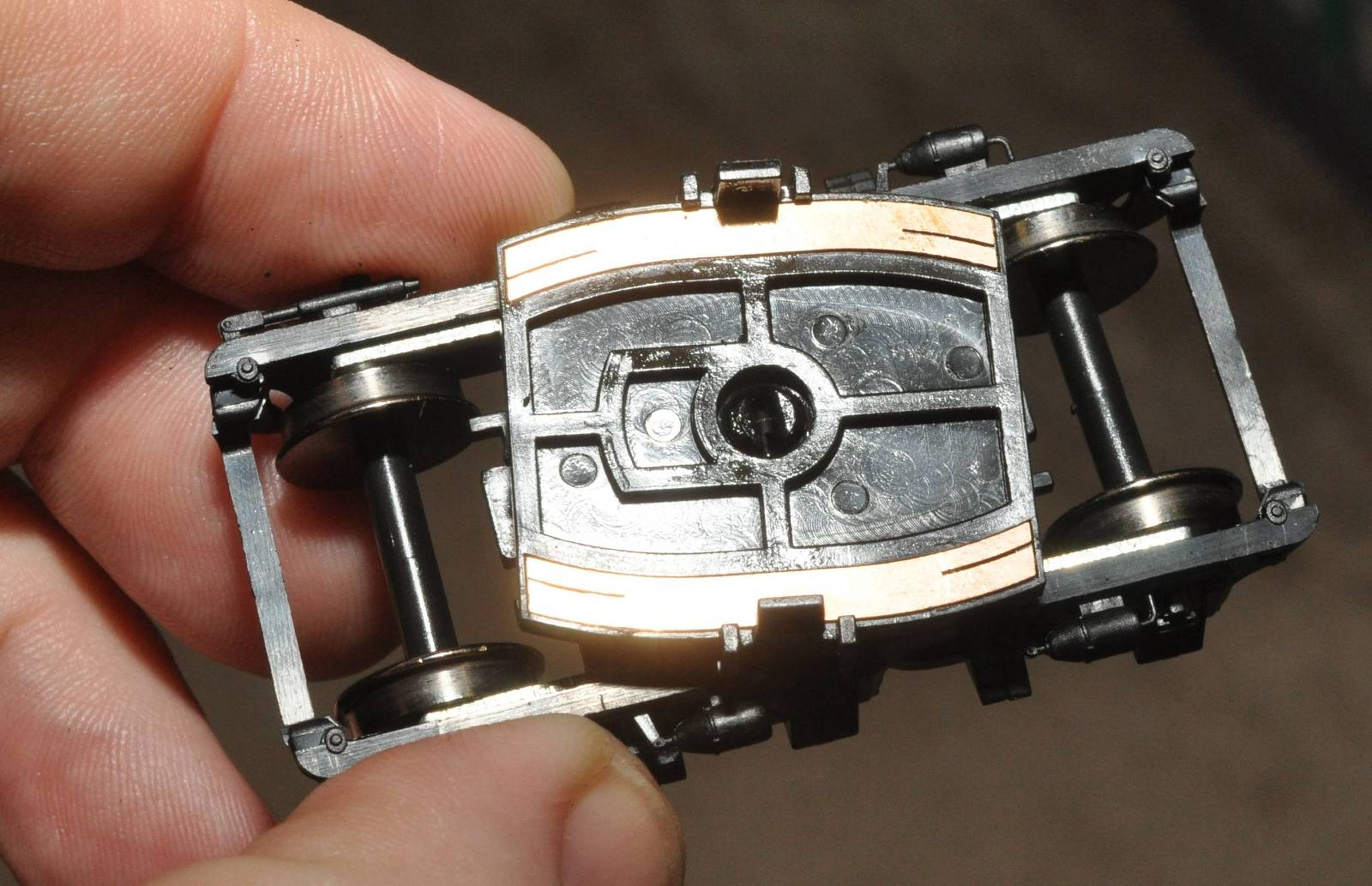 Now you need to make one other change. The screw and nut take up more space than the useless tit-pin that was originally used to engage the groove. The contact plate that snaps to the top of the truck passes the current from the truck to the car body via the copper plates. Won't hurt to put a dot of super glue on those because there's nothing really keeping them in place.