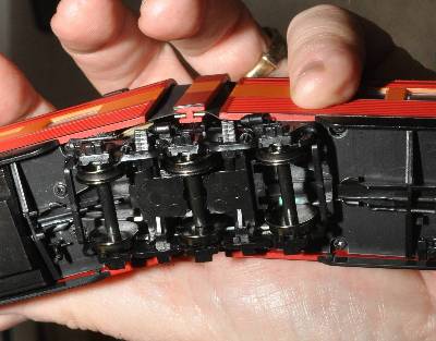 The articulated coaches - of where there are four pairs in my train - are difficult enough to re-assemble. The 3-unit diner, which has two of these joints, is pretty much impossible. You must assemble the first joint, then somehow assemble the second without disturbing the first, then pick up the three-foot long sausage carefully holding it by the joints, invert it, and then place it on the rails. If your hand even twitches, or you simply don't do a perfect job of inverting the car, it will pop apart again and you have to start over.