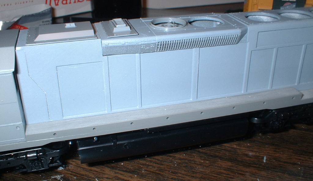 The dynamic brake section is a modified part from a Kato SD40-2. The molded on fans and exhaust stack