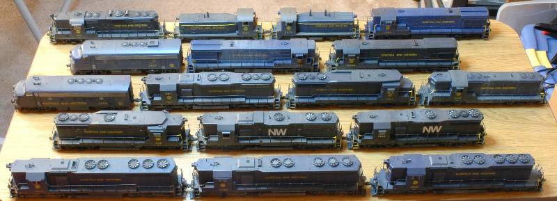 Row 1: GP9 733, SW8 2107, SW9 3374, U28B 1905 Row 2: F7A 3667, U28B 1904, U30B 8488 Row 3: F7A 3689, SD35 1521, GP30 2909, GP7 2413 Row 4: GP30 536, GP38AC 4101, GP35 1322 Row 5: SD45 1804, SD45 1769, SD40 1609