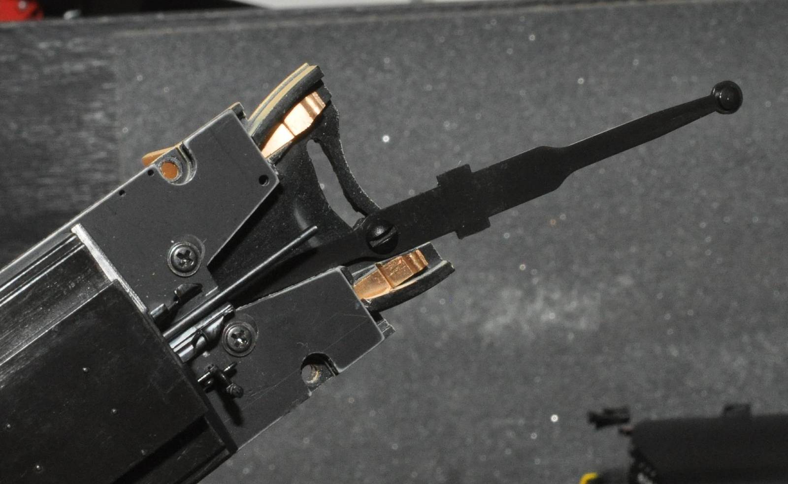 The truck and contact plate look like this in original form. The flat area between the contacts is what's supposed to keep the pin from disengaging the groove. It does not. What it does do.. well... is prevent you from ever re-engaging it on the track level. Well we don't need this anymore and in fact the screw head that's now holding it all together will rub against this and cause binding.