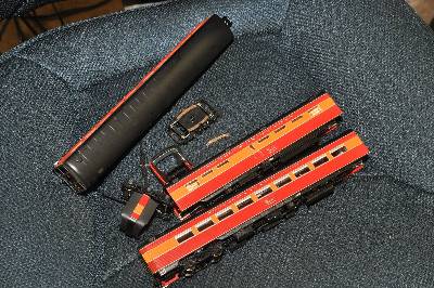 The articulated coaches - of where there are four pairs in my train - are difficult enough to re-assemble. The 3-unit diner, which has two of these joints, is pretty much impossible. You must assemble the first joint, then somehow assemble the second without disturbing the first, then pick up the three-foot long sausage carefully holding it by the joints, invert it, and then place it on the rails. If your hand even twitches, or you simply don't do a perfect job of inverting the car, it will pop apart again and you have to start over.