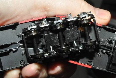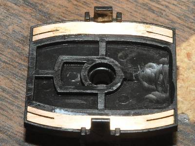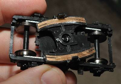 Now you need to make one other change. The screw and nut take up more space than the useless tit-pin that was originally used to engage the groove. The contact plate that snaps to the top of the truck passes the current from the truck to the car body via the copper plates. Won't hurt to put a dot of super glue on those because there's nothing really keeping them in place.